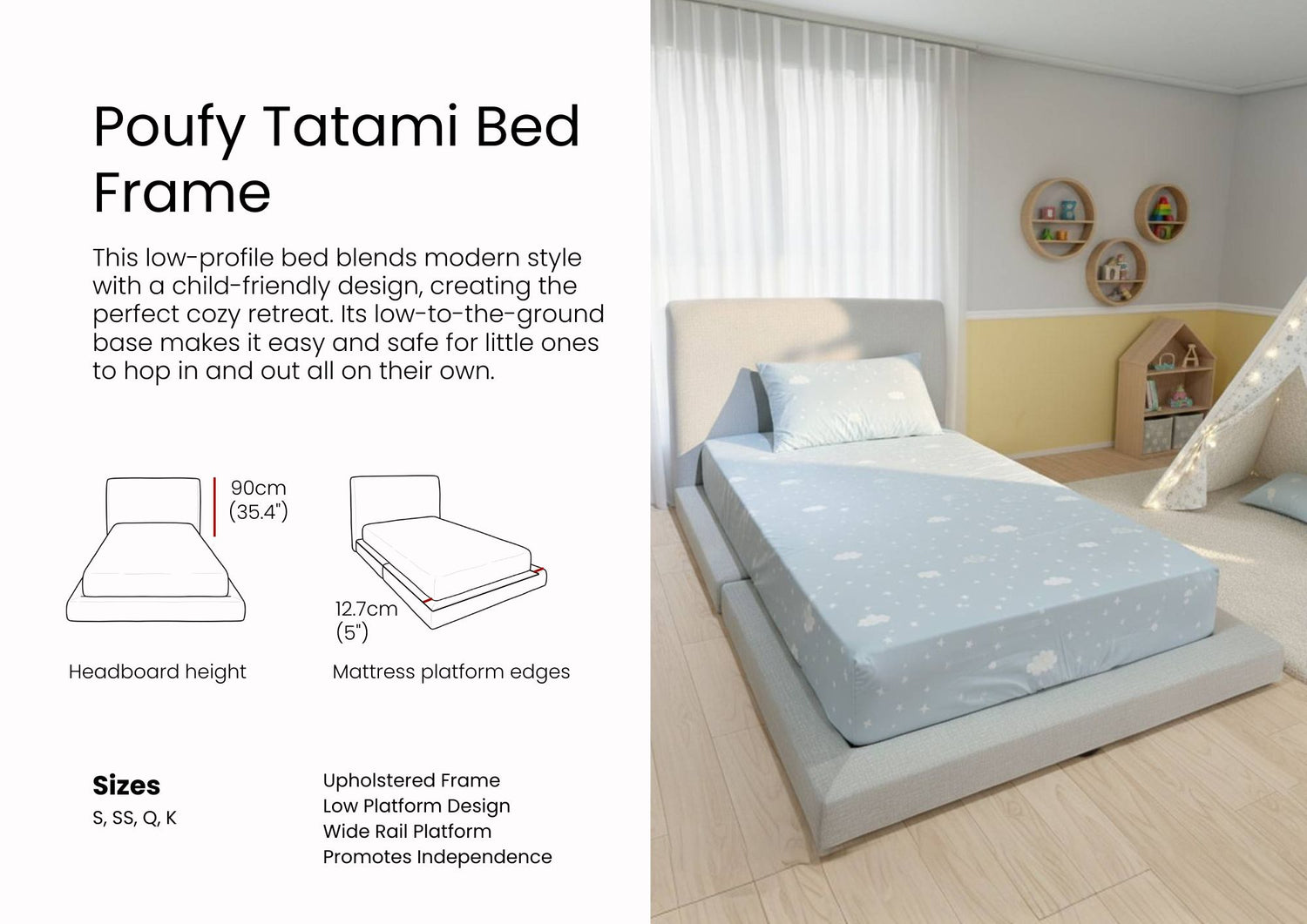 Meet the Poufy Cala Bedframe, a modern bed frame thoughtfully designed for toddlers and kids who love comfort, and for parents who want function and safety. With its pillowy-soft, waterproof...