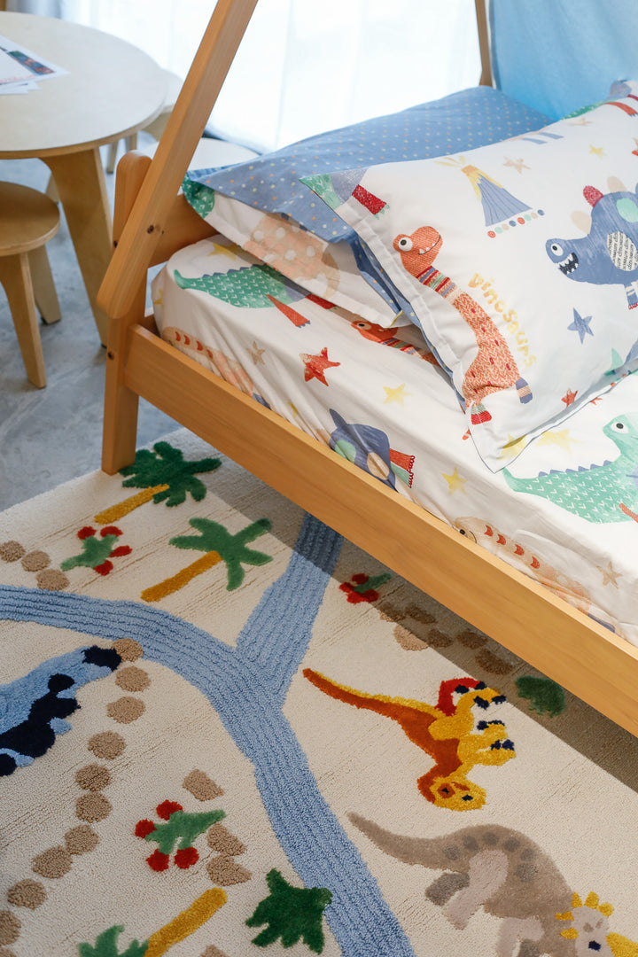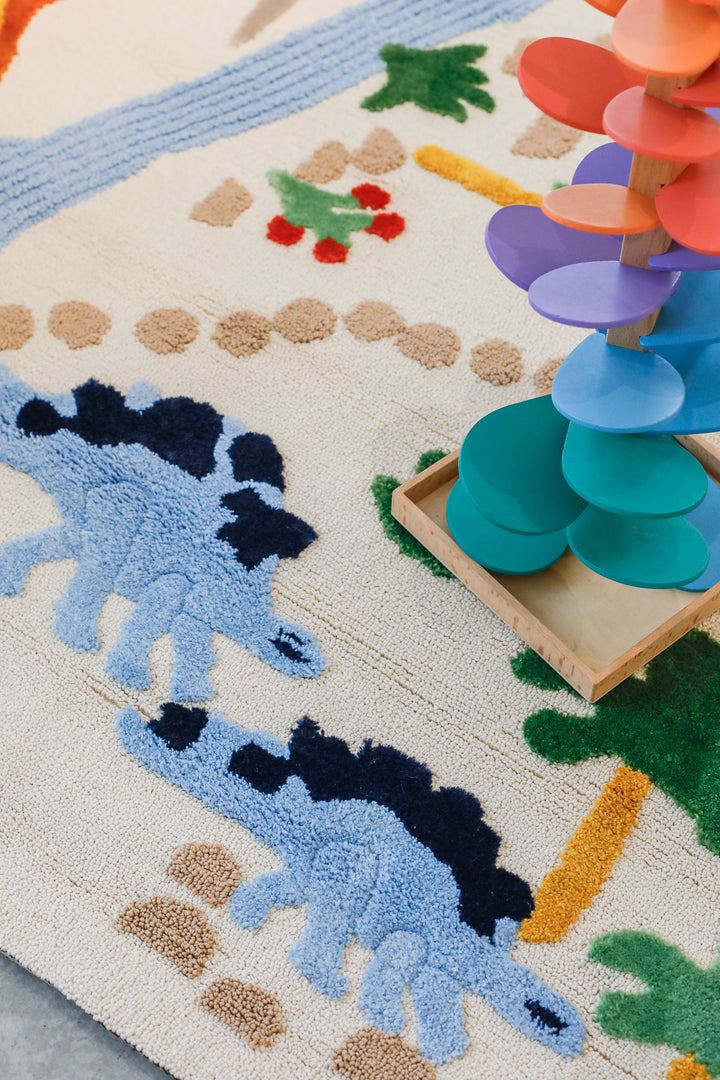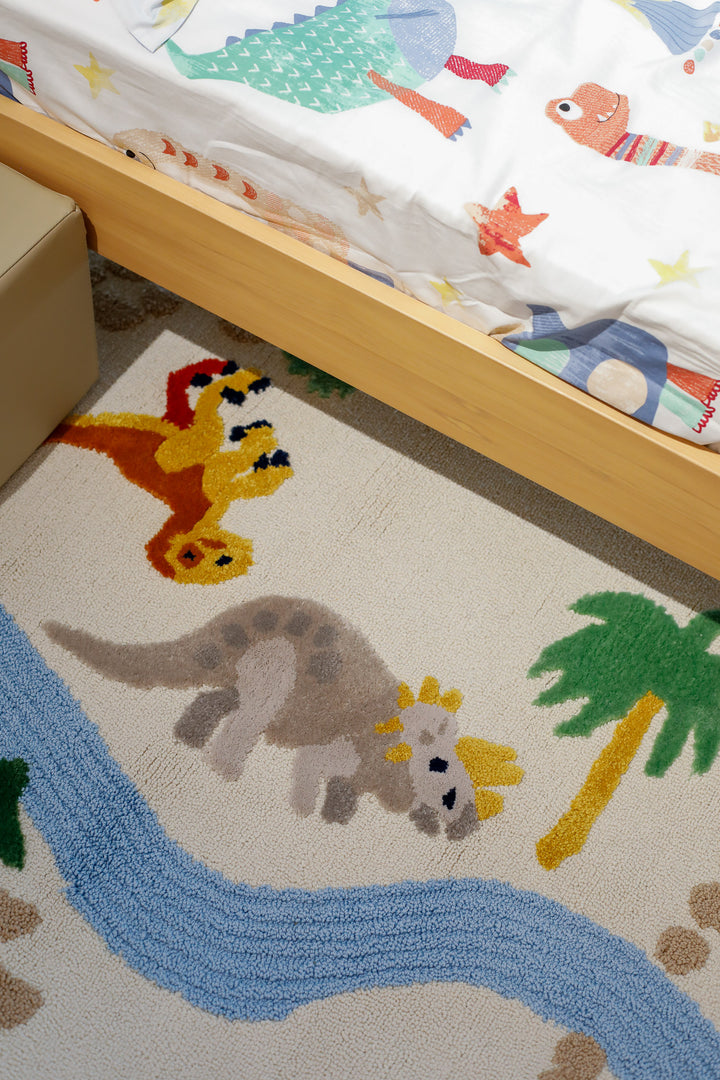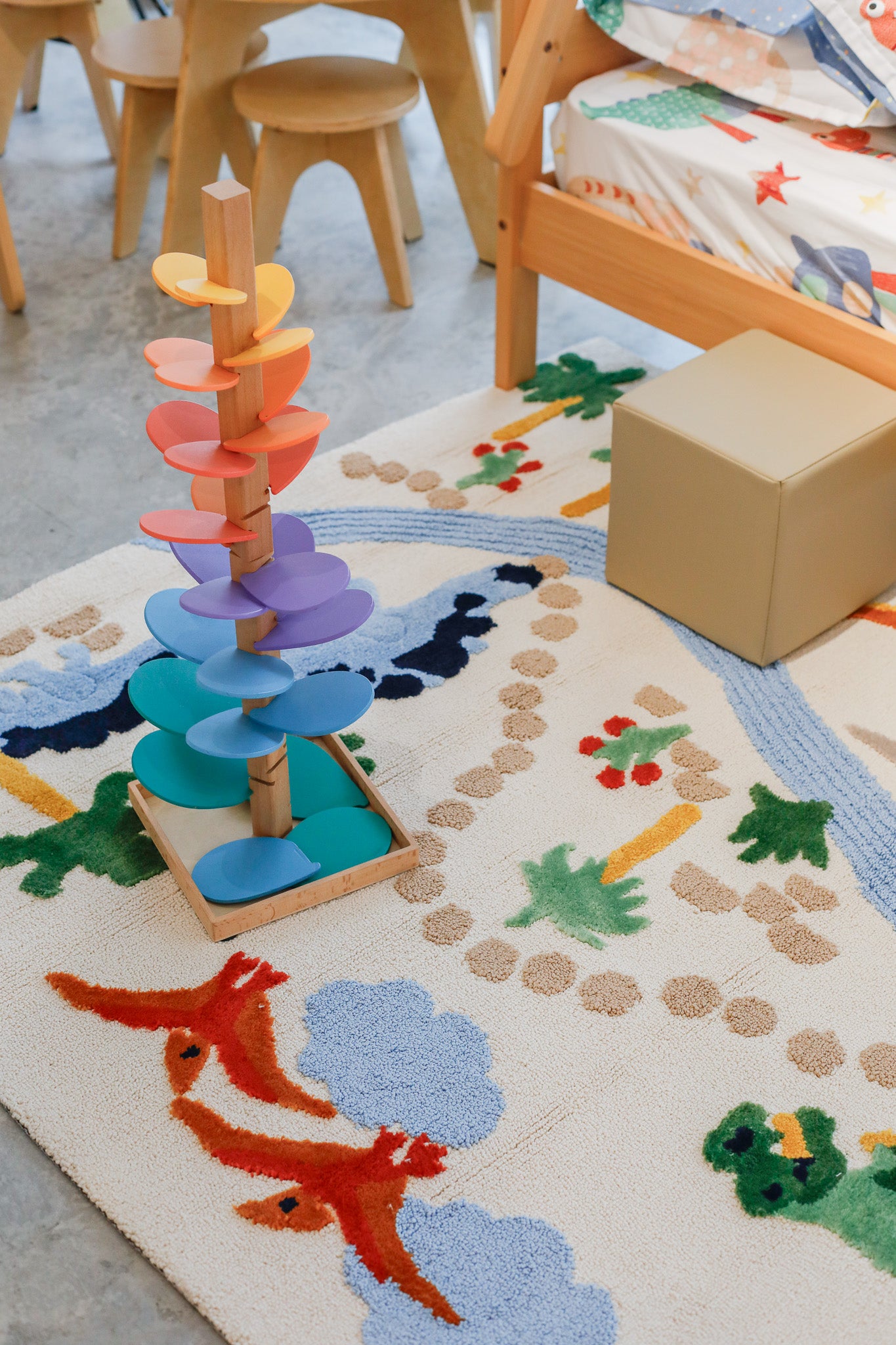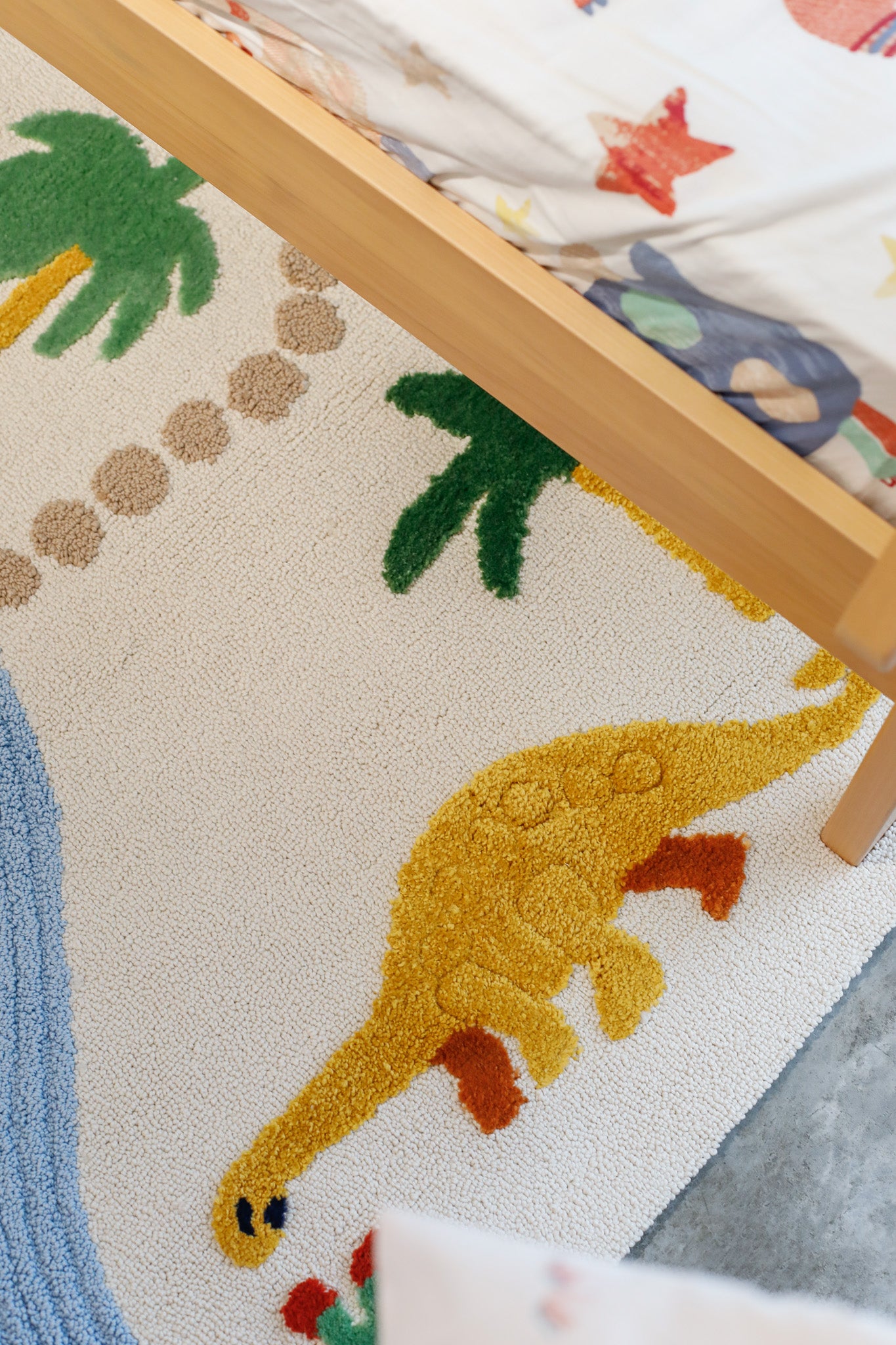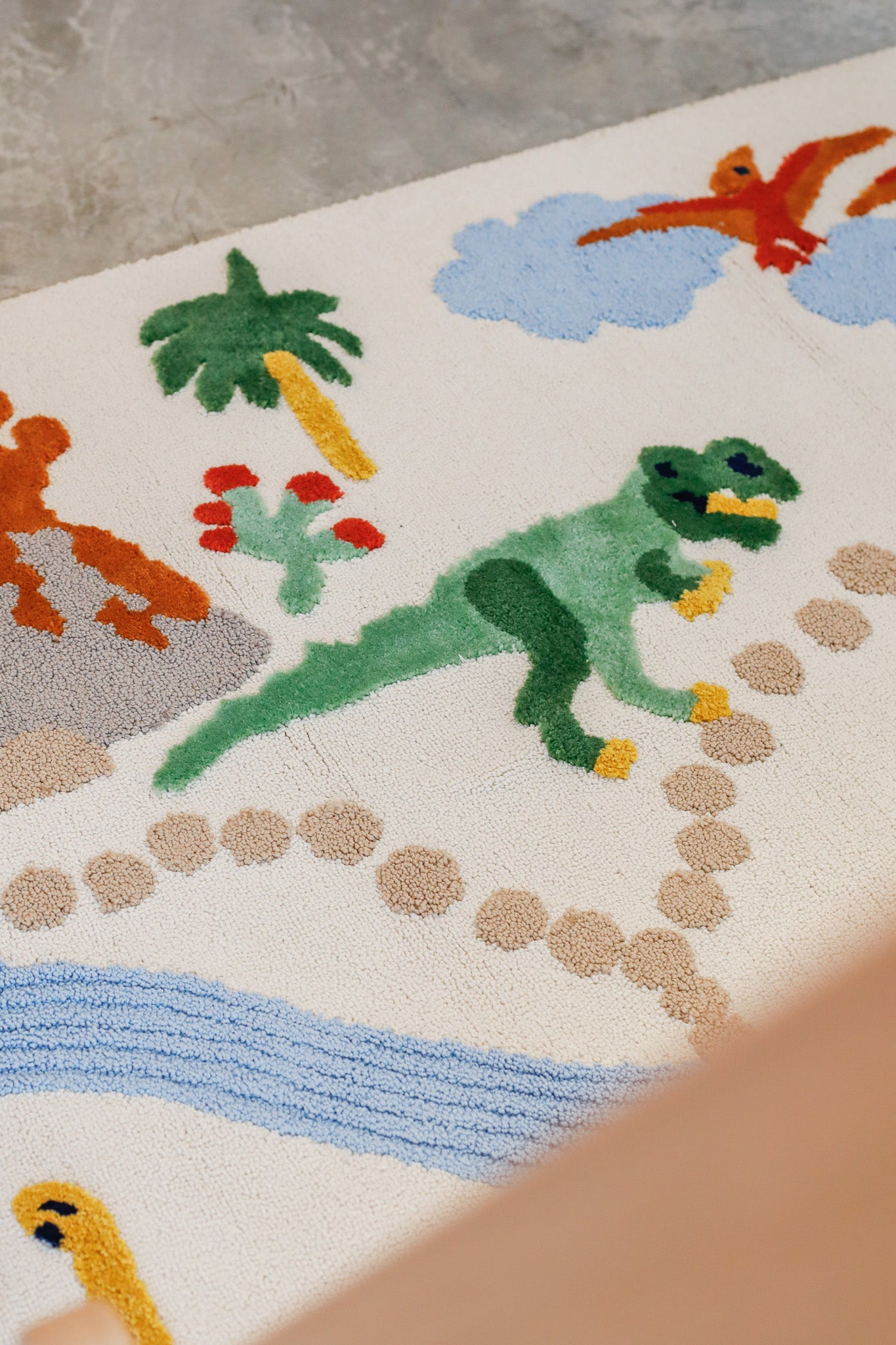 Bring the prehistoric world to life in your child's room with the Dinoland Adventure Play Rug! This vibrant rug showcases an exciting dinosaur-themed landscape featuring adorable dinosaurs, lush palm trees, flowing rivers, and a dotted path for endless imaginative play.