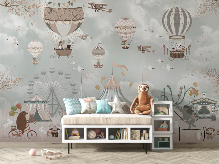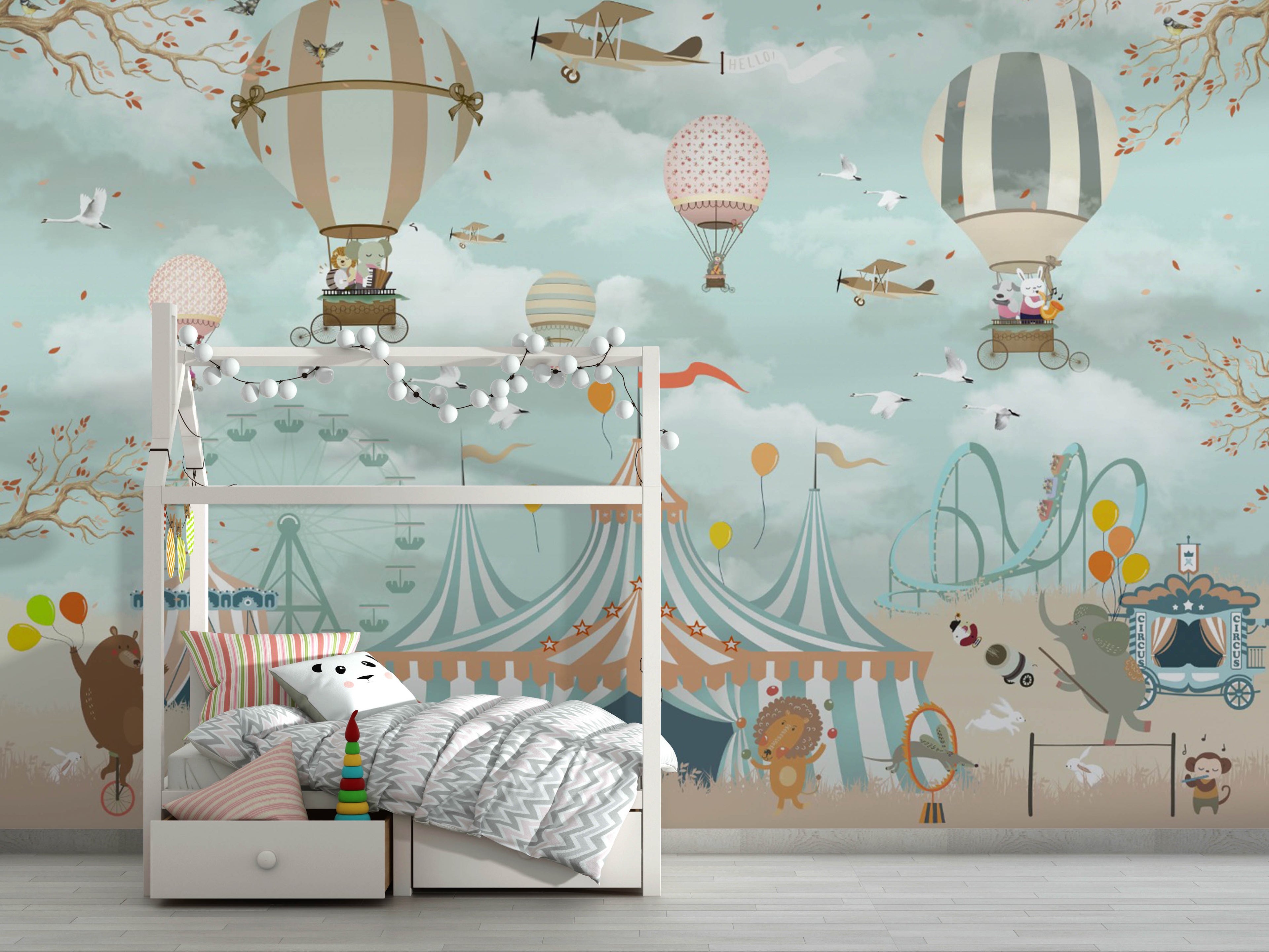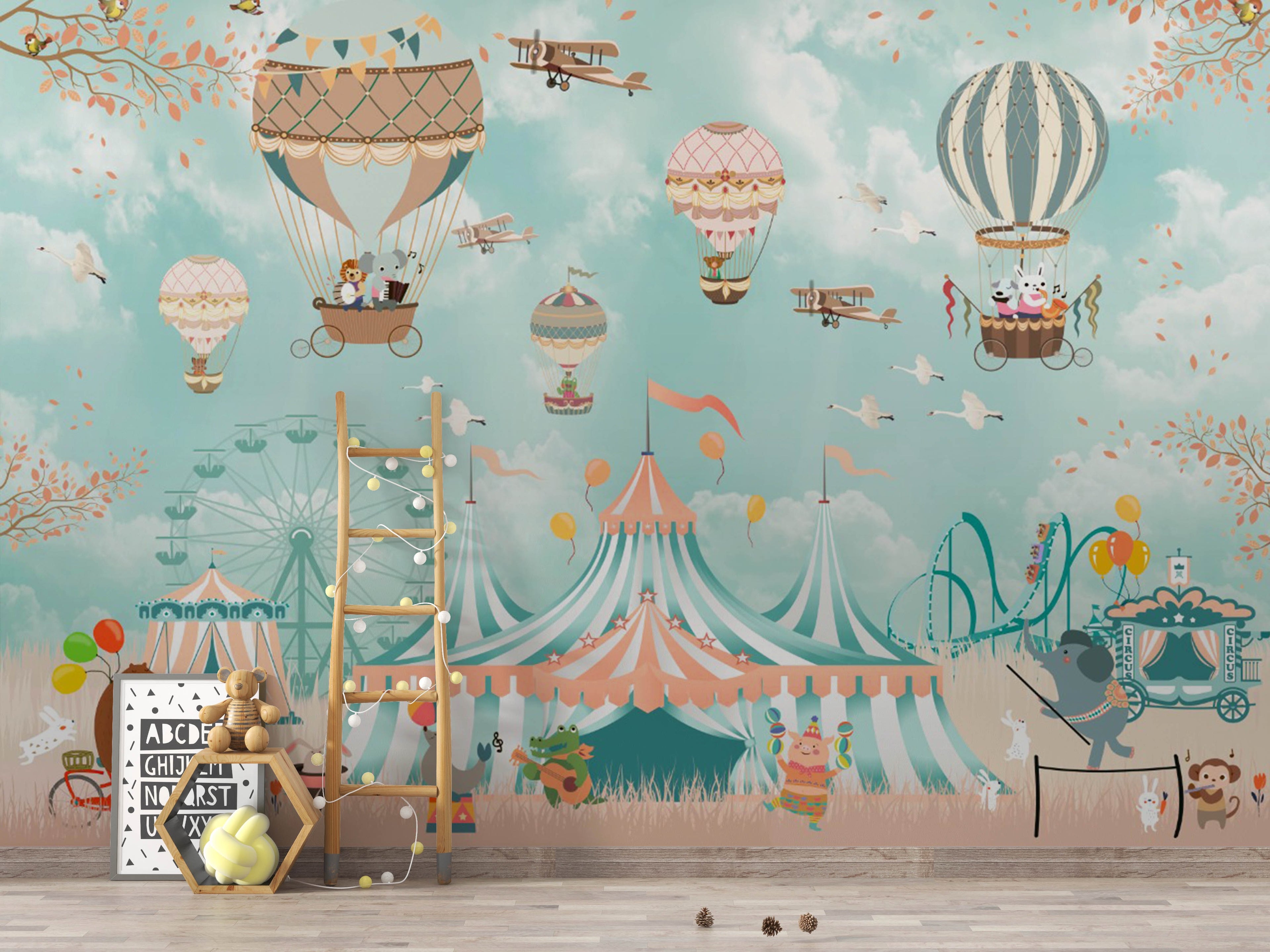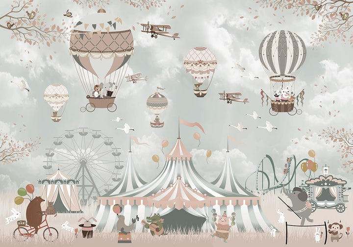 Step into a whimsical world of Cloud Nine Carnival wallpaper where the circus festivities meet the sky. This enchanting wallpaper brings a dreamy carnival scene to life, complete with floating hot air balloons, playful animals, and twinkling fairground rides. Soft pastel hues and charming illustrations create a magical atmosphere, perfect for sparking imagination in any child’s room. Let your little one drift into sweet adventures among the clouds.