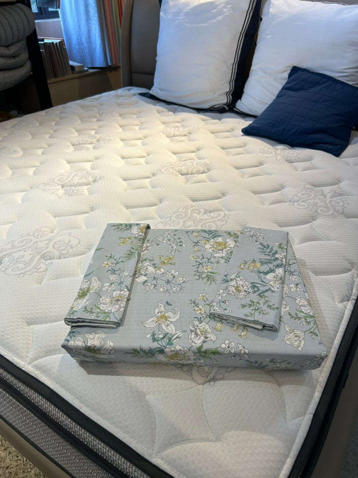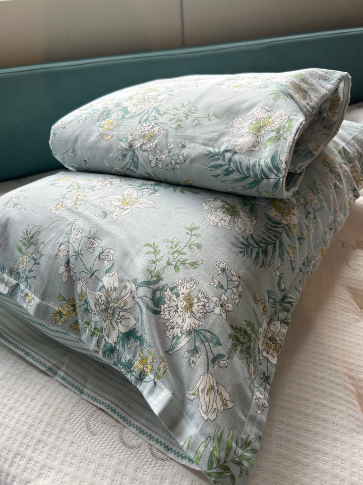 Wake up to the gentle beauty of a blooming garden with the Camelia bed sheet set. Featuring soft white florals dancing across a serene blue canvas, this design brings a breath of fresh air to your bedroom. It's a graceful blend of comfort and charm—perfect for those who love a soft, romantic touch in their space.