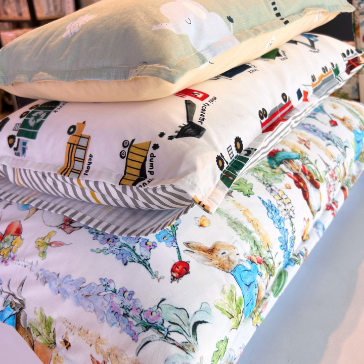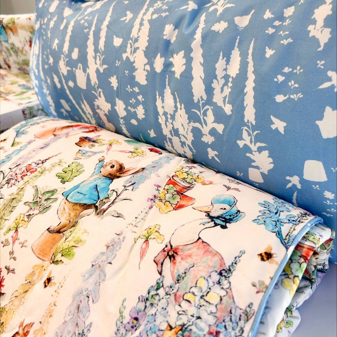 Embark on a bedtime journey with Beatrix Potter's timeless characters. 'Rabbit Garden' is a delightful blend of whimsy and nostalgia where the beloved Peter Rabbit and friends frolic amidst a blooming garden full of birds, butterflies, and bees zooming around pots and plants. Jemima Puddle Duck tends to fragrant flowers, Cottontail carries her treasured carrots, while Peter Rabbit himself enjoys a snack. The cozy print brings the magic of classic tales to your little one's sleep sanctuary.