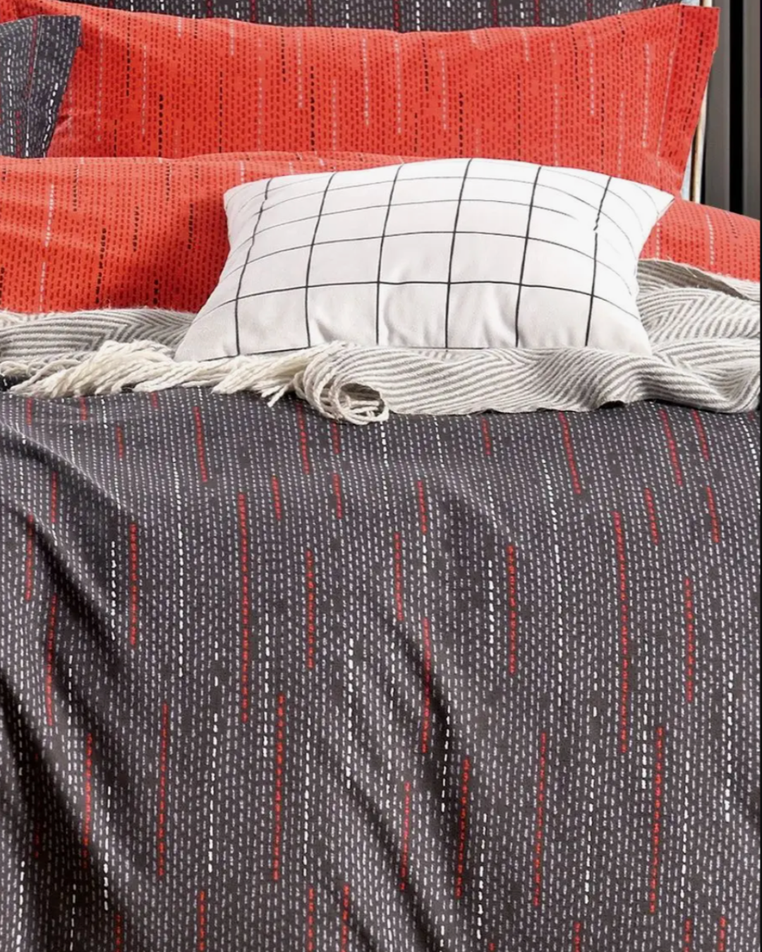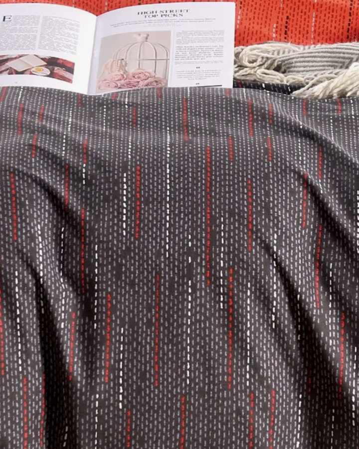 Simplicity doesn’t have to be plain. 'Affinity' strikes the perfect balance between understated elegance and striking contrast. The deep charcoal fabric, accented with subtle linear patterns, creates a sleek and modern foundation, while the bold red hues add just the right amount of energy. It’s a design that speaks volumes without being overwhelming—perfect for those who appreciate clean aesthetics with a touch of personality.