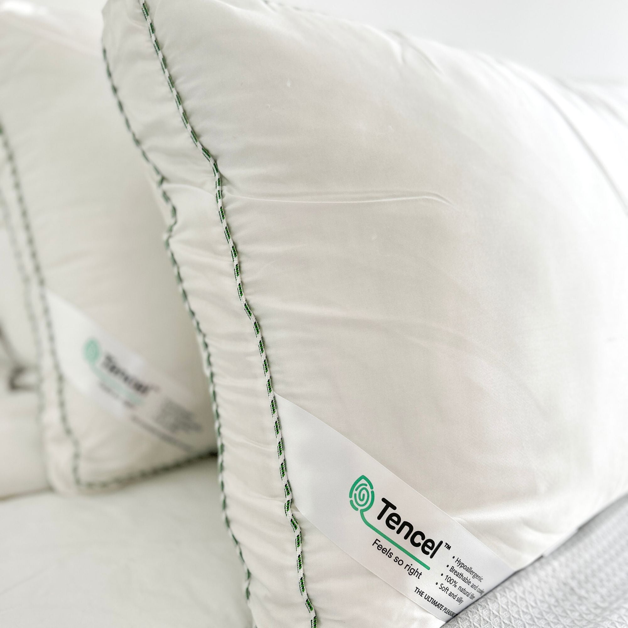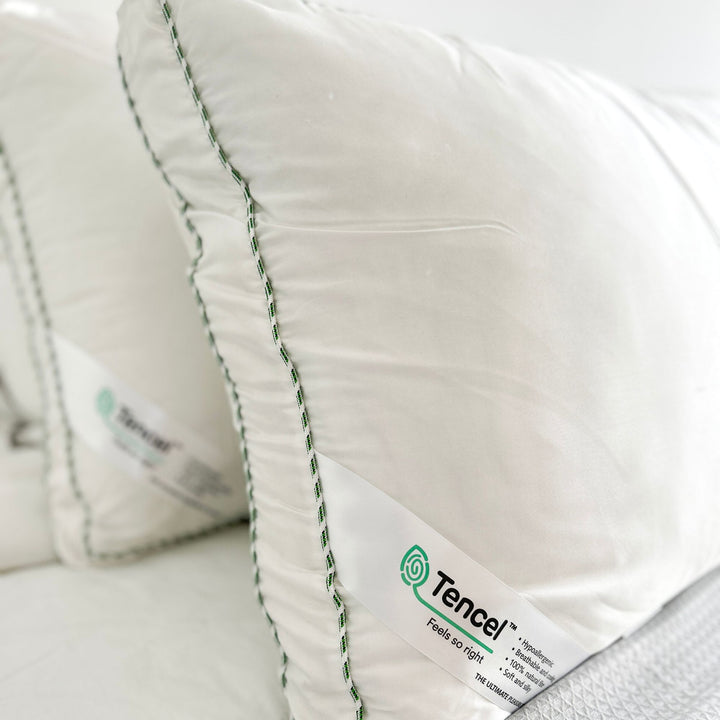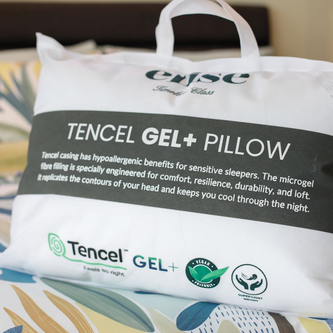 Our new and improved Tencel GEL+ Pillow has a Tencel casing that has hypoallergenic benefits for sensitive sleepers. The microgel fibre filling is specially engineered for comfort, resilience, durability, and loft. It replicates the contours of your head and keeps you cool through the night.