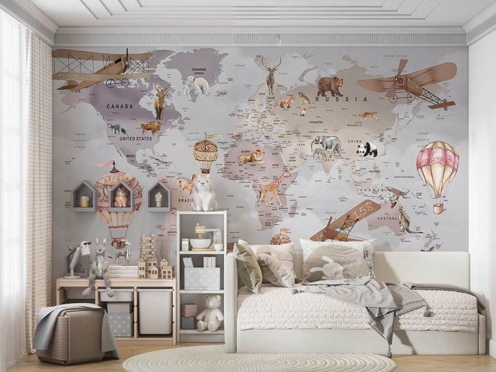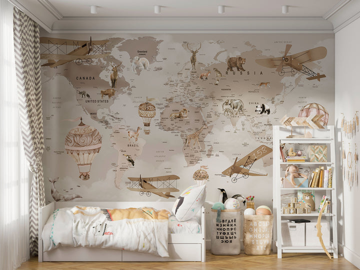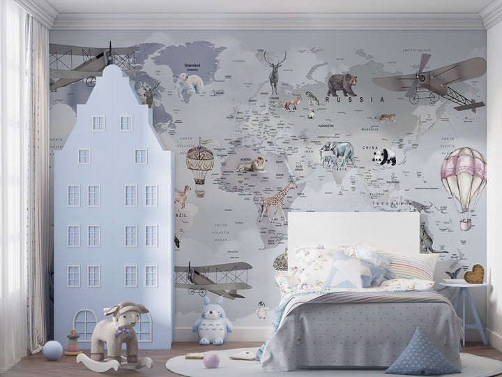 Turn your child's room into a gateway to adventure with the Explorer’s World Wallpaper. Featuring beautifully illustrated continents, native animals, vintage planes, and whimsical hot air balloons, this design sparks curiosity and a love for travel. Perfect for little explorers, it’s both educational and enchanting, making learning about the world an everyday experience.