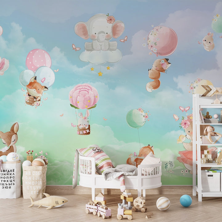 Drift into a dreamy sky adventure with the Floating Dreams wallpaper, where playful woodland friends soar among the clouds! A soft pastel blue sky sets the scene for adorable foxes, bunnies, and elephants floating gracefully in floral-adorned balloons, surrounded by fluttering butterflies and twinkling stars. This enchanting design creates a magical and uplifting atmosphere, perfect for nurseries, playrooms, or any child’s space.
