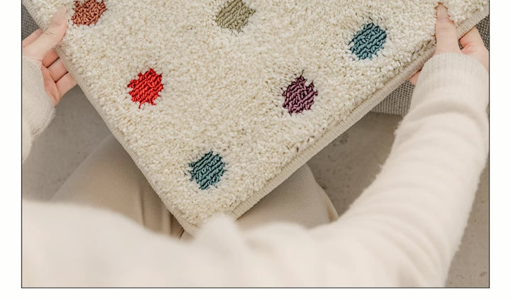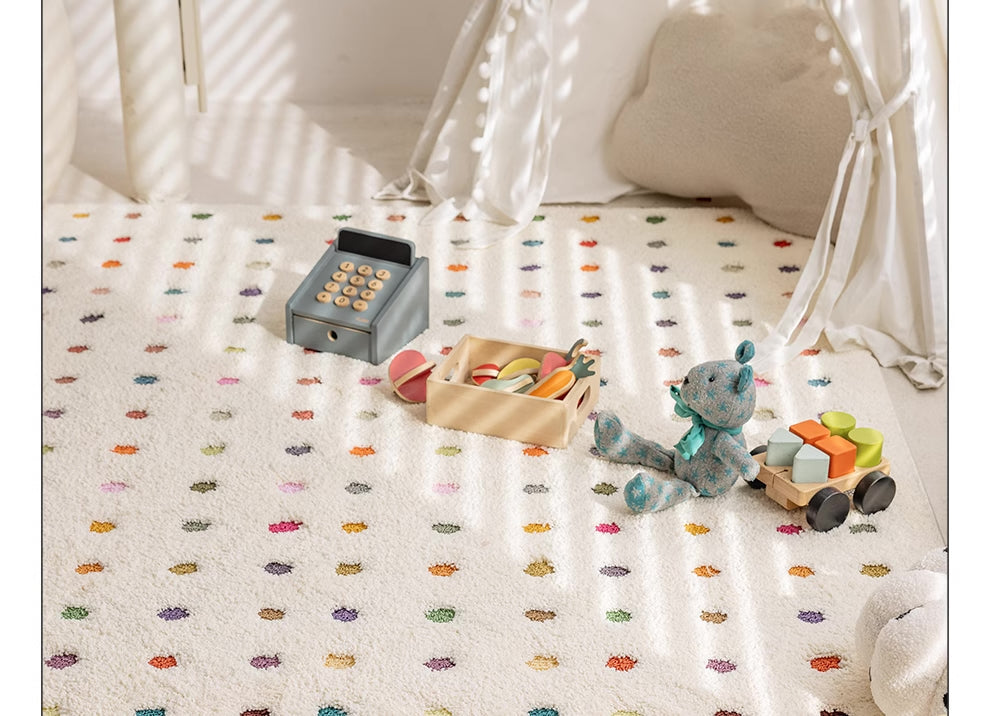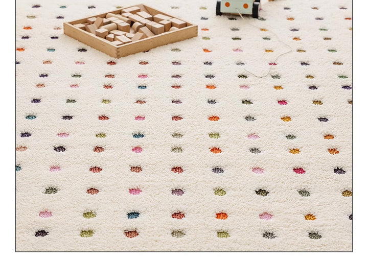 This delightful rainbow dot rug brings a touch of playful charm to any space. Handtufted from 100% polyester in India, it celebrates the artistry of traditional craftsmanship while offering a soft and durable surface perfect for kids' rooms or play areas. The rug features vibrant multicolored dots set against a neutral base, adding a whimsical yet refined look. A combination of cut and looped pile enhances the texture and dimension, while intricately carved motifs add depth.