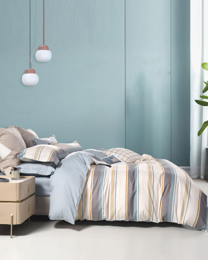 Sleek, structured, and effortlessly modern— Merrick combines warm neutrals with soft blues in a clean striped pattern that speaks to understated sophistication. The balanced palette brings a calm yet contemporary edge to any bedroom, while the breathable fabric offers comfort that lasts through every season. Perfect for those who appreciate subtle design with a timeless appeal.