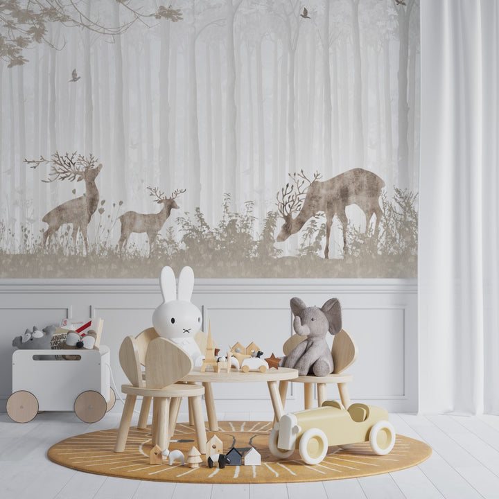 Immerse your little one in a soothing woodland retreat with this breathtaking forest mural. Featuring majestic deer grazing in the misty wilderness, this neutral-toned design brings a sense of calm and connection to nature. The soft, earthy hues complement a minimalist or Scandinavian-inspired nursery, creating a timeless and cozy atmosphere. Perfect for fostering a love for nature and wildlife, this mural transforms any space into a peaceful sanctuary where imagination and serenity coexist.