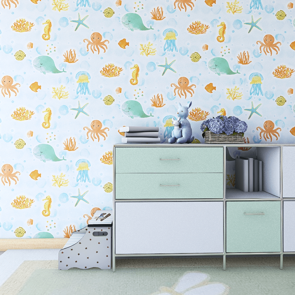 Bring the wonders of the deep sea into your child’s room with our Ocean Friends Wallpaper. Featuring adorable whales, playful octopuses, jellyfish, seahorses, and coral reefs in soft pastel tones, this wallpaper turns any space into a cheerful underwater escape. The gentle color palette of seafoam green, sunshine yellow, and coral orange adds a calming yet vibrant charm, perfect for nurseries, playrooms, or bedrooms. Printed on durable, easy-to-clean material, it’s as practical as it is delightful—ready to spark curiosity and endless imaginary sea voyages.