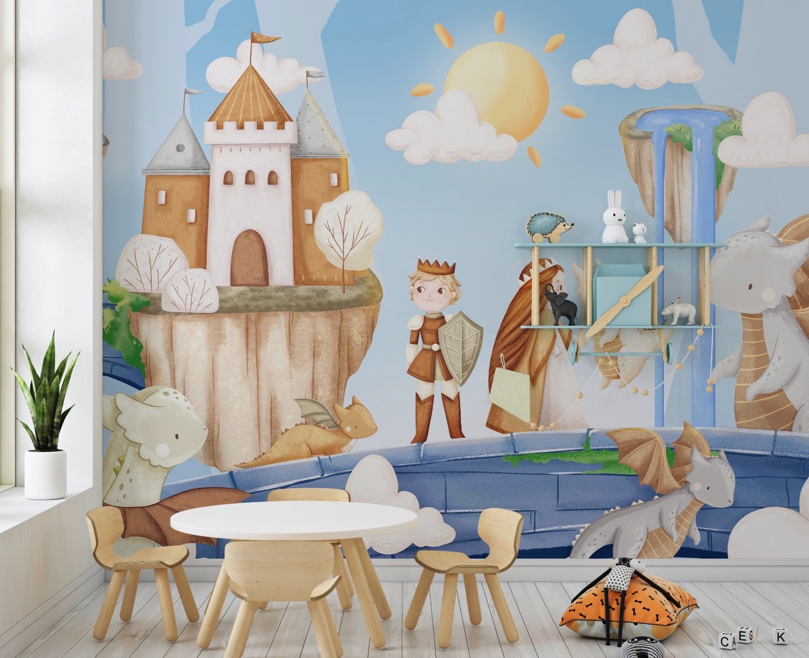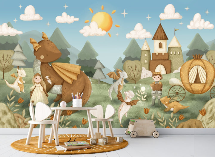 This whimsical wallpaper transforms any space into a fairytale dream, where brave little knights, gentle dragons, and enchanted forests come to life. The warm, earthy tones and charming illustrations invite young imaginations to explore a world of wonder, courage, and endless storytelling.