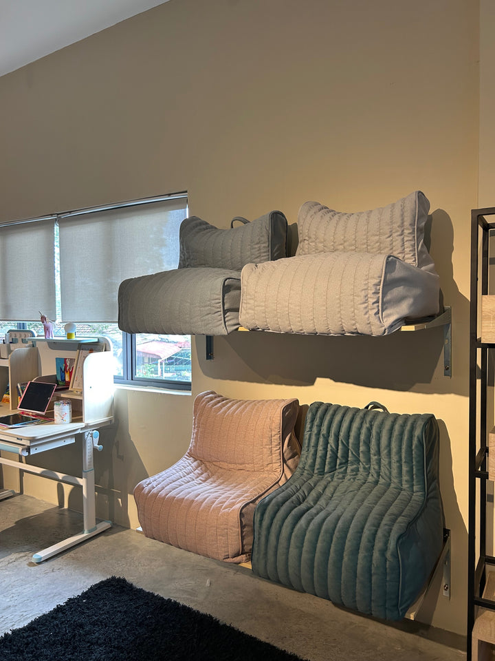The Poufy Ottoman is the ultimate add-on for your child’s chill zone. Soft yet supportive, it works great as a footrest, a mini seat, or even a comfy play surface for books and board games. Its quilted cover and cloud-like feel make it a favourite for lounging and relaxing. Perfect to pair up with our Poufy Beanbag Sofas in matching colours.