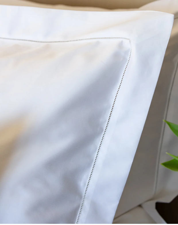 Inspired by minimalist design, which strips away decorative elements to reveal the essential qualities of a piece, White Heimstitches maintains an understated—and modern—elegance. Its special hand comes from an innovative finishing process, which makes the percale feel super-sleek.
