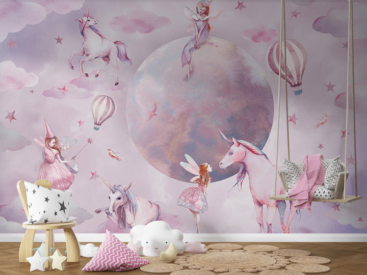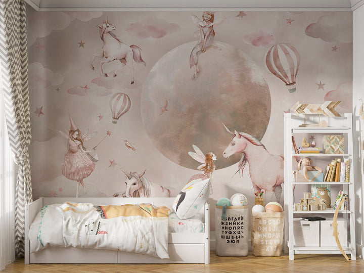 Transform your child’s space with Unicorn Realm Wallpaper, a high-quality wallpaper that brings magic to life. Featuring graceful unicorns, delicate fairies, and floating hot air balloons, this dreamy design is printed on premium paper with a smooth, durable finish. The soft pastel hues create a soothing ambiance, making it the perfect backdrop for a cozy and imaginative haven.