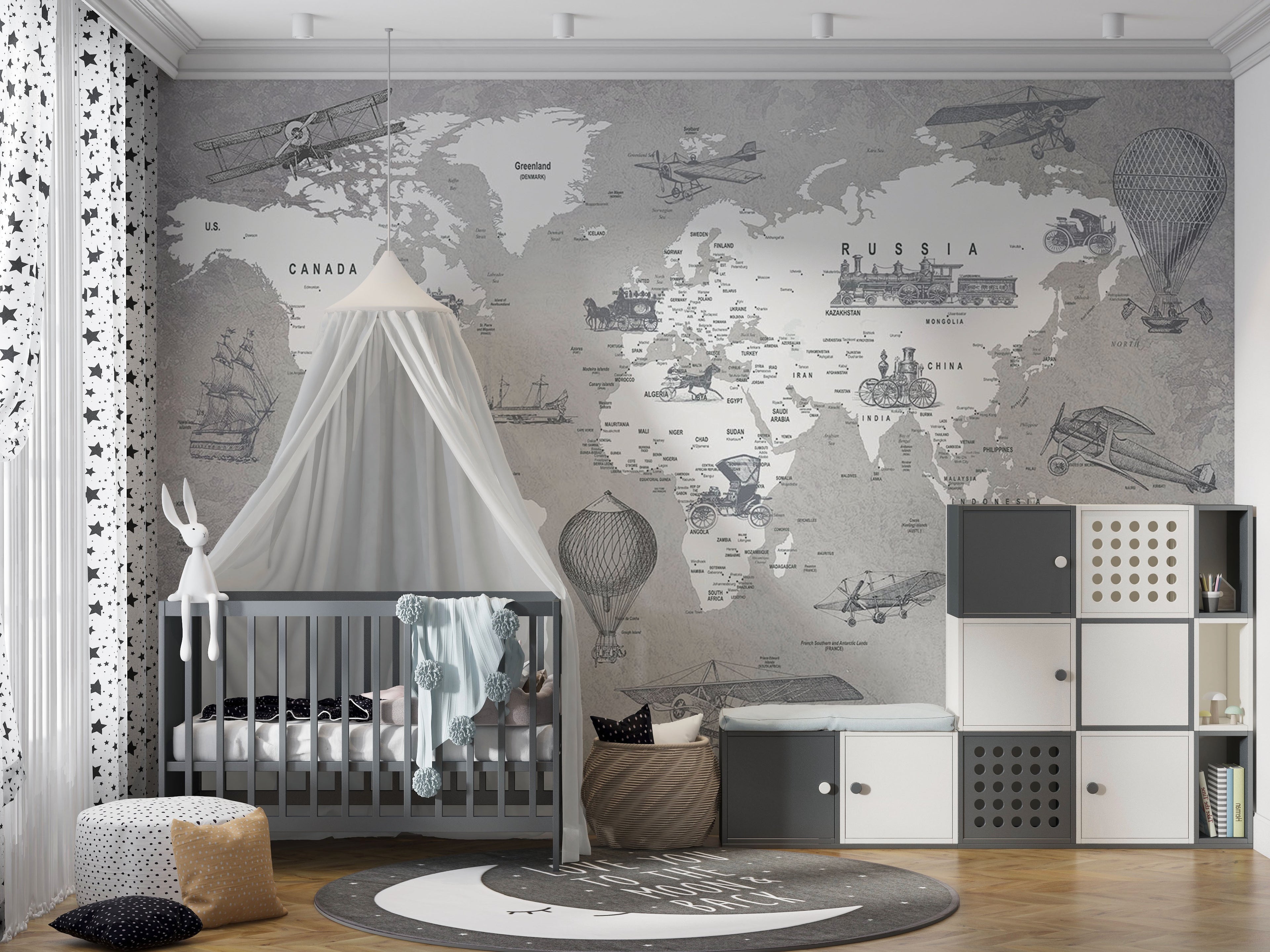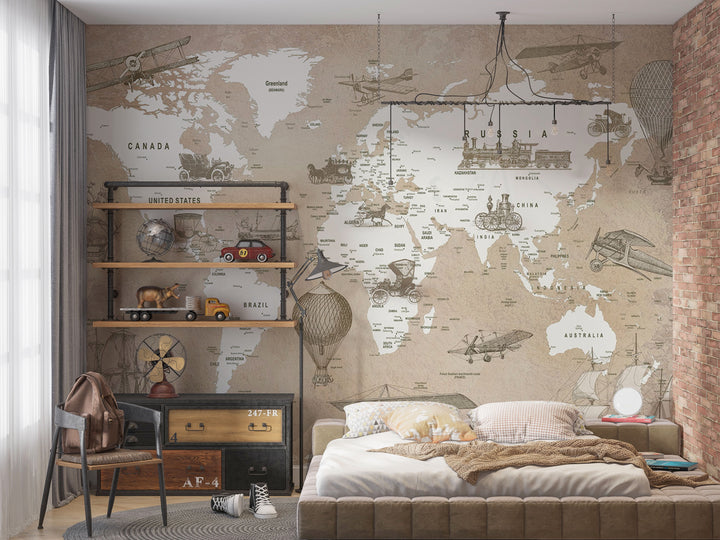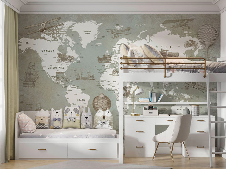 Let your little adventurer set sail on a journey through time with this Vintage Explorer's World wallpaper. Featuring beautifully illustrated airplanes, ships, and early automobiles, this monochrome design brings history to life while adding a timeless charm to the nursery or kids’ room. Perfect for inspiring curiosity, wanderlust, and a love for discovery, this wallpaper is a dreamy backdrop for every young explorer’s imagination.